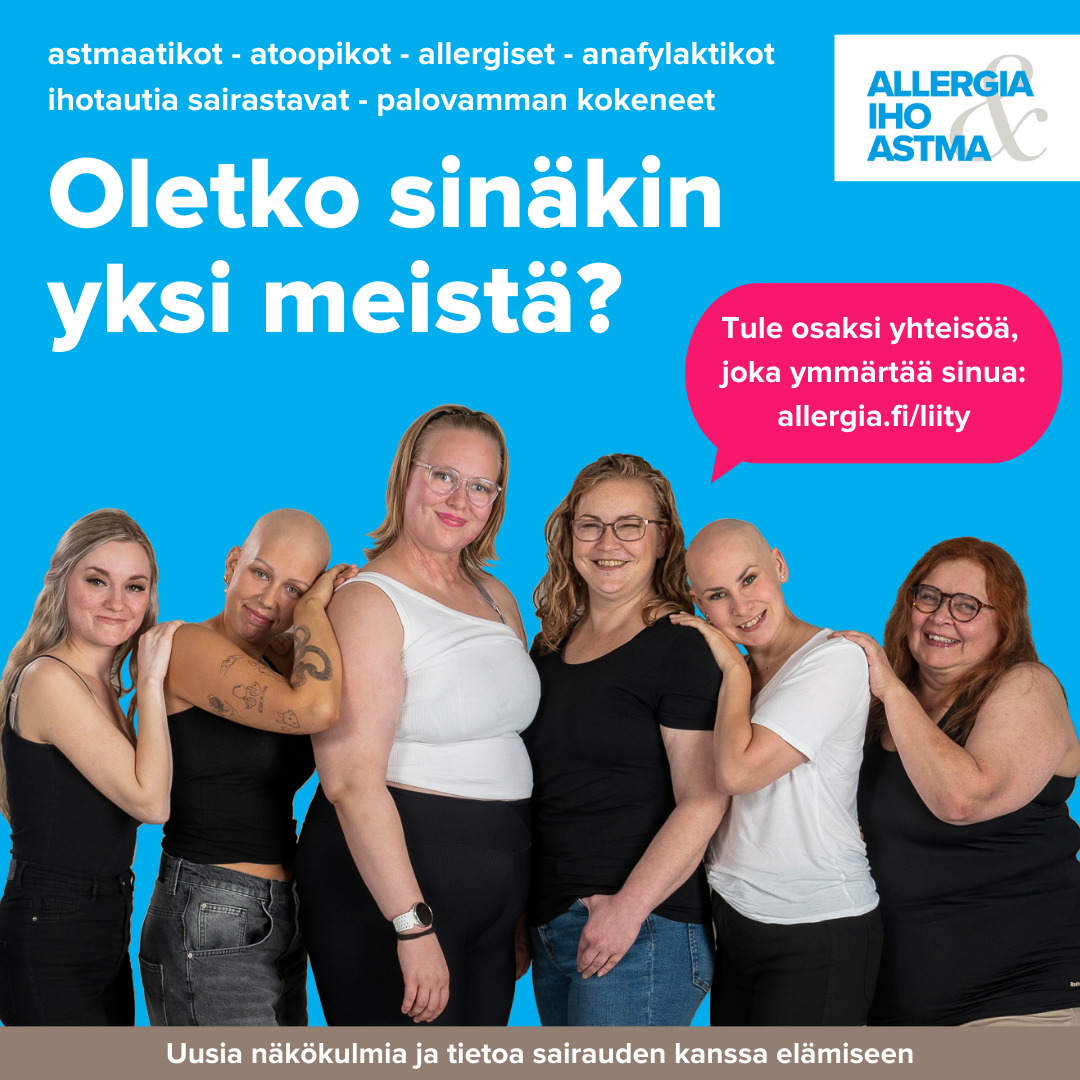Liity jäseneksi! Jäsenenä saat mm. Allergia, Iho & Astma -lehden neljä kertaa vuodessa. Voit osallistua yhdistyksen tapahtumiin ja hyödyntää valtakunnallisia jäsenetuja. Tule mukaan vapaaehtoiseksi ja vaikuttamaan allergiaa ja astmaa sairastavien paremman arjen puolesta.